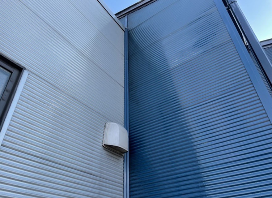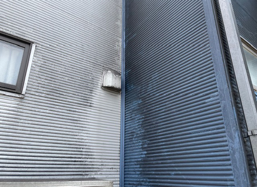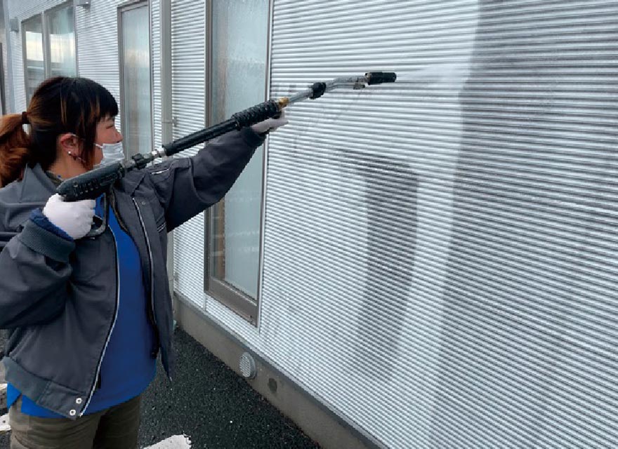 高圧洗浄機を使用し、外壁にこびり付いた汚れを洗い落とします。